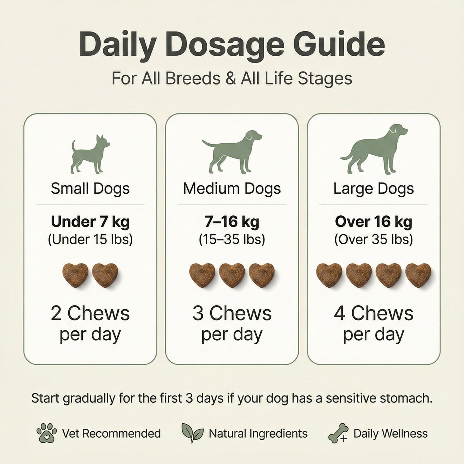 Perfect during food transitions, stressful periods, or simply as part of a daily wellness routine. These chews help your dog regain natural comfort, without medication, without side effects, without hassle.
